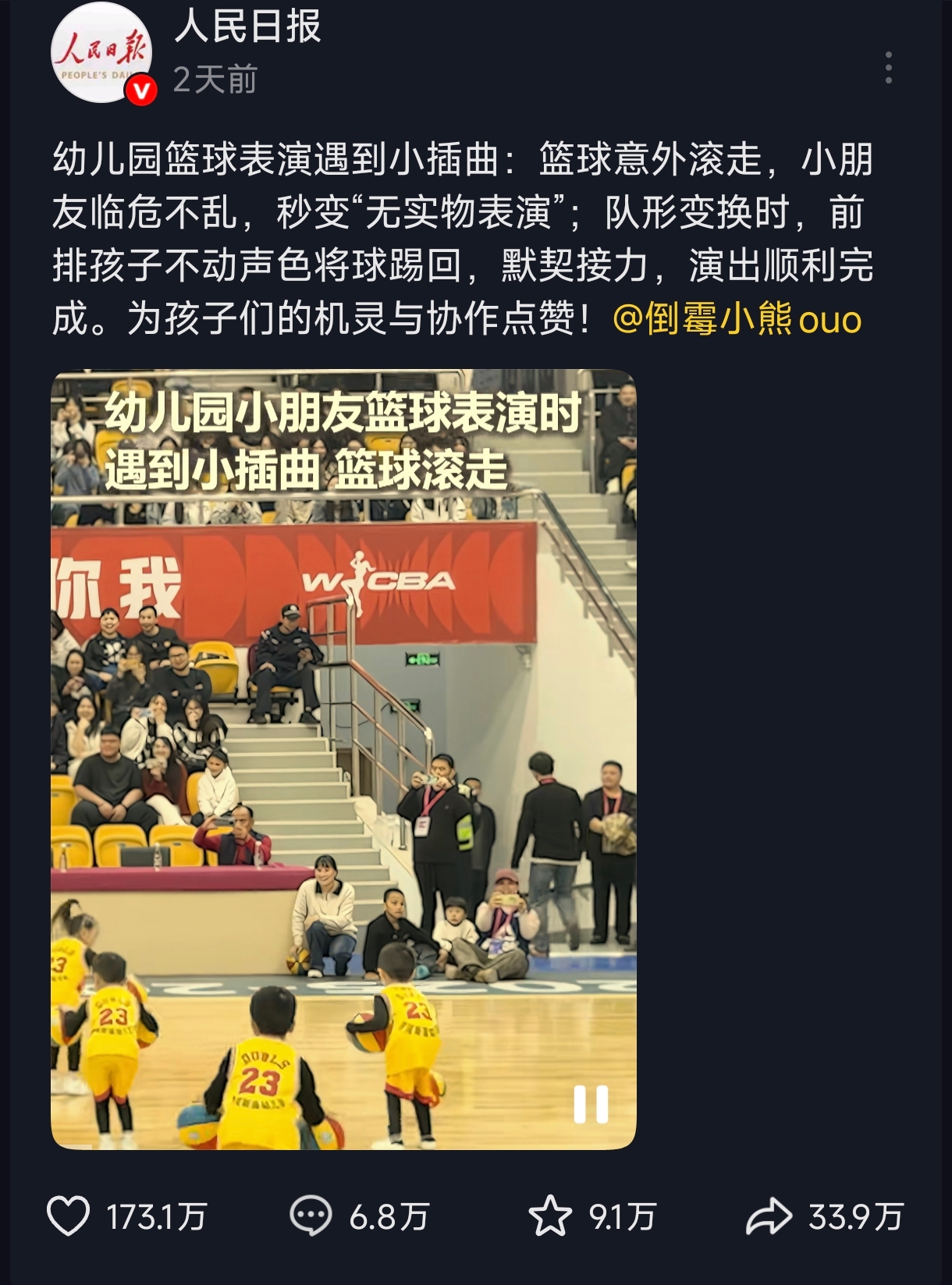 近日,一段幼儿园小一又友在WCBA女篮比赛中场扮演篮球操的视频,在抖音平台获取了超百万个点赞,并被东说念主民日报、央视新闻等多家泰斗媒体转载。