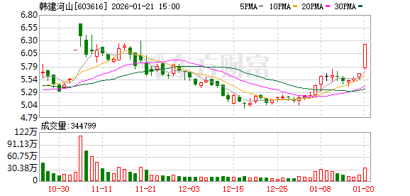 值得一提的是,1月20日,韩建疆域股价涨停,涨幅达10.07%,收盘股价达6.23元/股,公司总市值为24.38亿元。1月21日,韩建疆域在上交所因环节事项未公告停牌。
